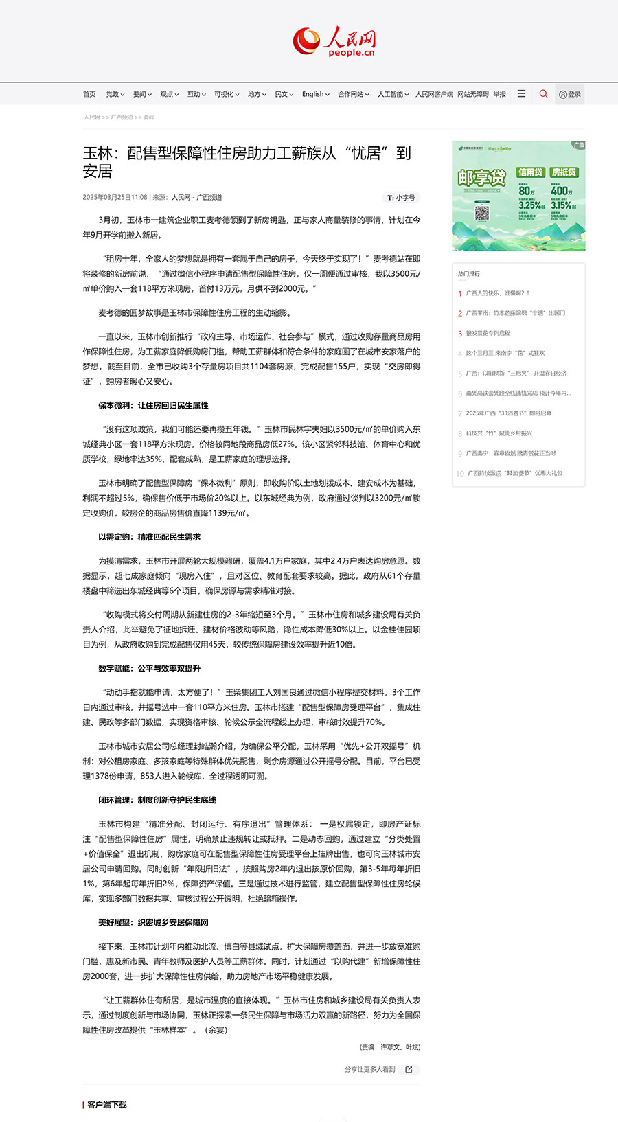 3月25日,人民网刊发《玉林:配售型保障性住房助力工薪族从“忧居”到安居》