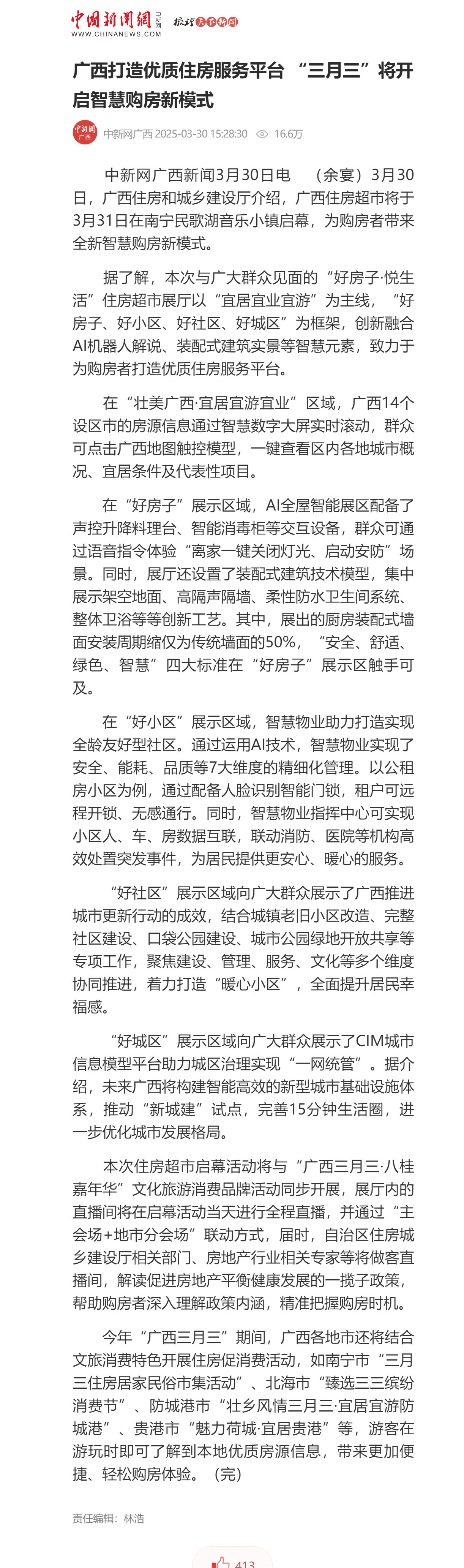 2025年3月30日,中国新闻网发布《广西打造优质住房服务平台 “三月三”将开启智慧购房新模式》