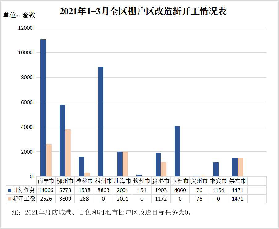 (一)全区棚户区改造新开工目标任务完成情况。2021年,全区棚户区改造目标任务为新开工4.4万套。截至3月25日,新开工1.14万套,完成年度开工任务的25.98%。其中,棚户区改造建设进度较快、开工量达2000套以上的设区市有:柳州(3809套)、南宁(2626套)和北海市(2001套);尚未开工的设区市有:梧州、钦州、玉林和来宾市。