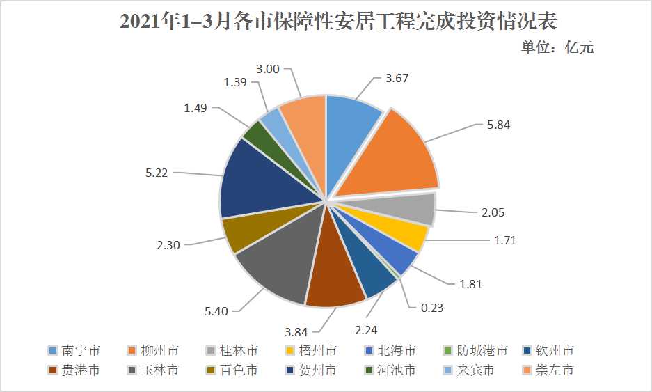 (一)全区公共租赁住房筹集情况。2021年,南宁、桂林和北海市计划筹集公共租赁住房5570套。截至3月底,已开工600套,完成年度开工任务的10.77%。