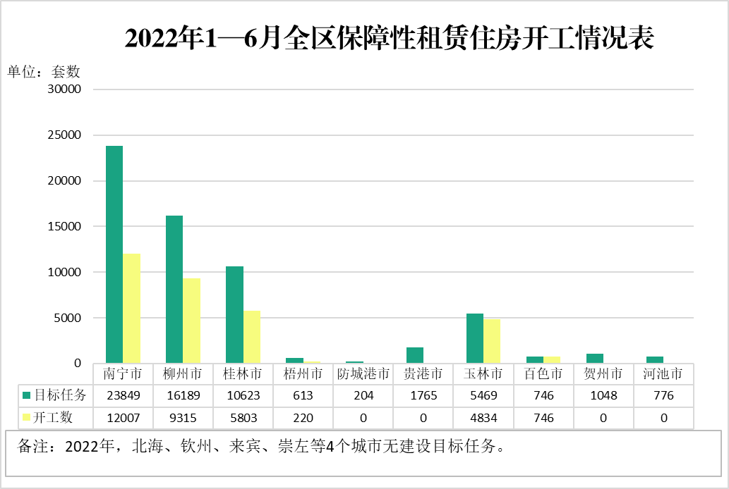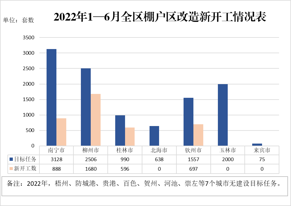 (一)全区棚户区改造新开工目标任务完成情况。2022年,全区棚户区改造新开工目标任务为10894套。截至6月25日,新开工3861套,完成年度开工任务的35.44%。其中,棚户区改造建设进度较快的设区市有:柳州市(1680套)、南宁市(888套)、钦州市(697套)和桂林市(596套);完成率较高的设区市有:柳州市(67.04%)和桂林市(60.20%)。