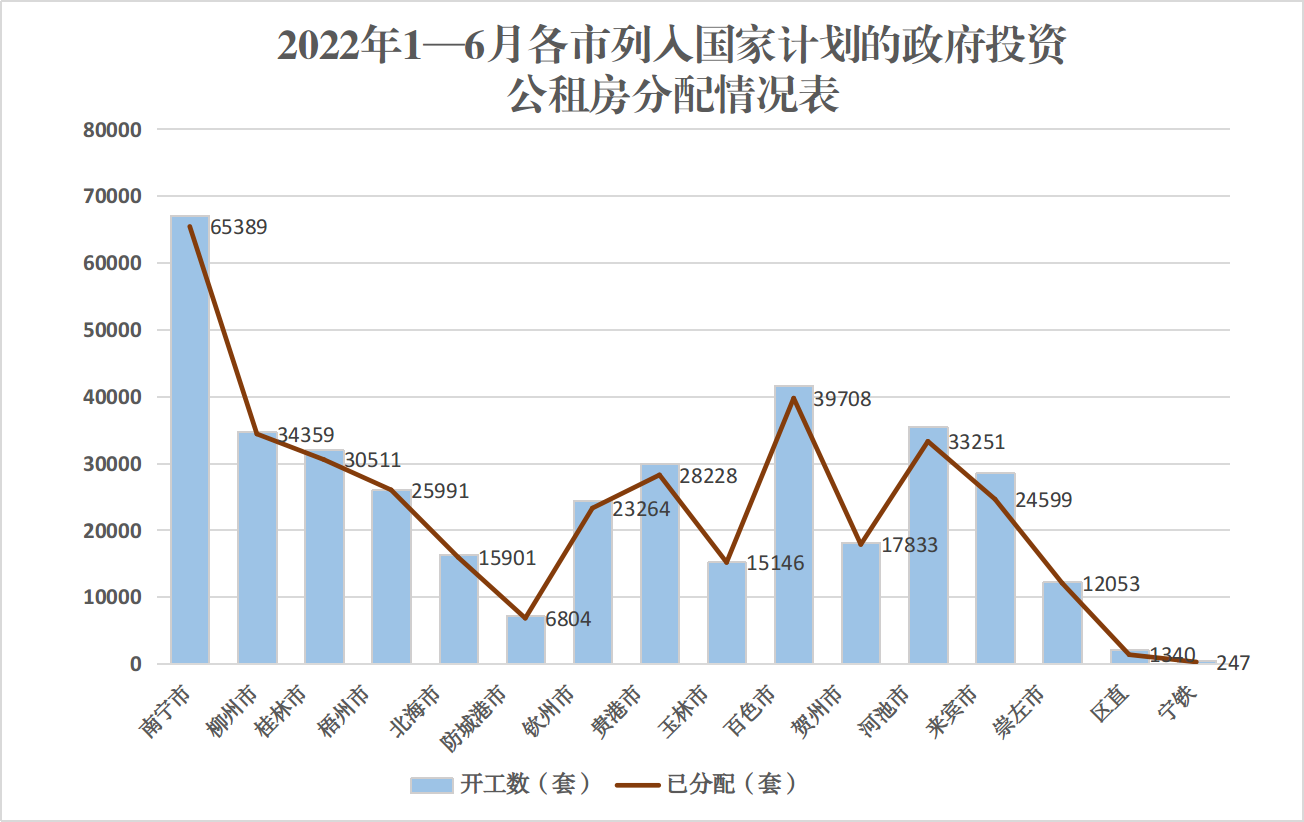 (一)全区公租房分配情况。截至6月25日,全区列入国家计划的公租房累计开工建设48.82万套(2015年以前开工建设46.93万套,2016-2021年开工建设1.89万套),已分配44.85万套。其中,列入国家计划的政府投资公租房累计开工建设40.34万套(2015年以前开工建设39.15万套,2016-2021年开工建设1.18万套),已分配37.46万套。